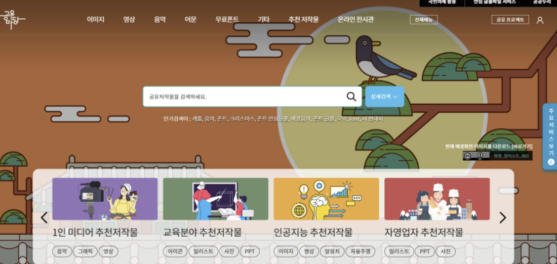 한국저작권위원회에서 저작권 보호기간이 지난 저작물을 자유롭게 이용할 수 있게 개설한 웹사이트다. 저작권이 만료된 저작물이나 공공저작물, 지적재산권자가 기증한 저작물의 정보와 저작물 파일을 서비스하고 있기때문에 무료로 상업적 사용이 가능합니다.