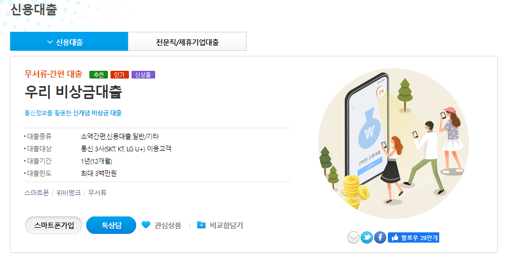 우리은행에서 제공해주는 통신정보를 활용한 신개념의 비상금 대출로 통신3사(SKT,KT,LG U+)에서 통신등급 산출이 가능한 사람들이면 누구나 신청 가능합니다. 확실하고 정확한 우리은행의 공식 대출 내용 및 조건 안내를 가장 빠르게 확인하시려면 아래의 공식 발표 링크를 클릭하시면 가장빠르게 확인해보실 수 있습니다.