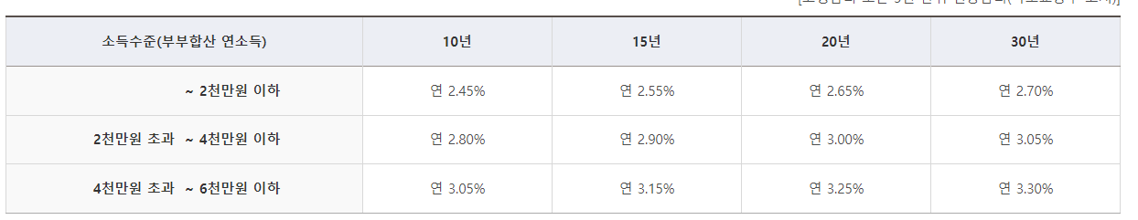 5. (소득) 대출신청인과 배우자의 합산 총소득이 연간 6천만원 이하(생애최초주택구입자, 신혼가구, 다자녀가구, 2자녀 가구는 연간 7천만원)인 자
