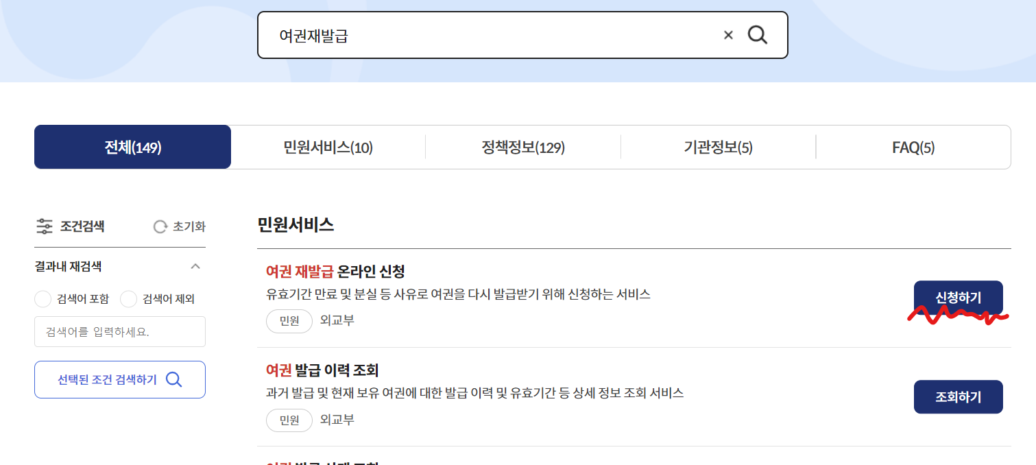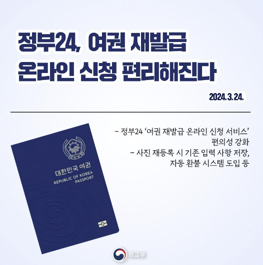 여권 재발급 신청은 정부 24를 통해 본인 인증 후 가능합니다.