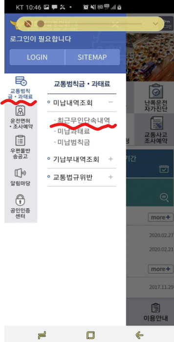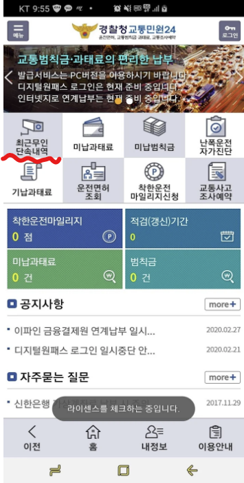 메인화면에서 최근 무인단속내역을 클릭합니다. 본인인증 완료 후 조회가 가능합니다.
